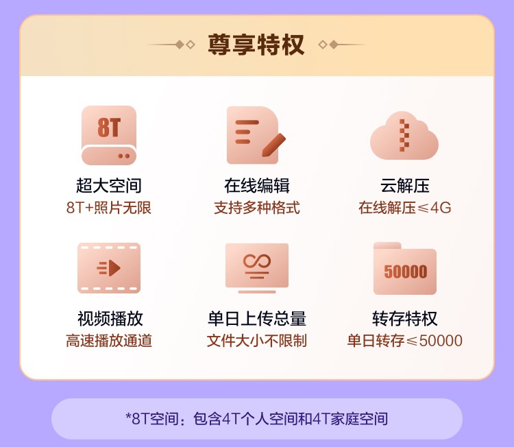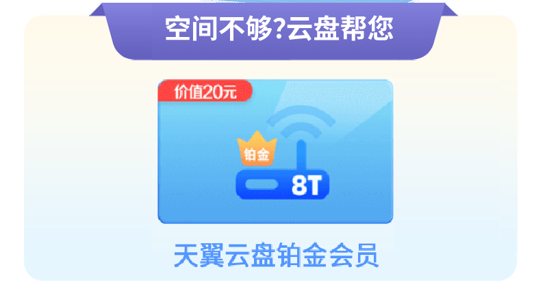4、通过本活动页面办理天翼云盘会员服务,为广东电信话费代扣方式付费产品,与天翼云盘客户端等互联网支付方式办理的会员可秀加办理。如,在天翼云盘客户端微信支付办理了1年的AI铂金会员,又通过本次活动页面办理了话费代扣 按月付费的AI铂金会员服务,用户的空间有效期将会齊加,则个人空间和家庭空间将分别叠加为4+4=8T。如您的空间为 非天鼐云盘客户端或非官方网站正常订购或其它正常途径获得,在本页面办理会员,将不会进行叠加,而是按照本页面 订购会员对应的空间大小为您更新