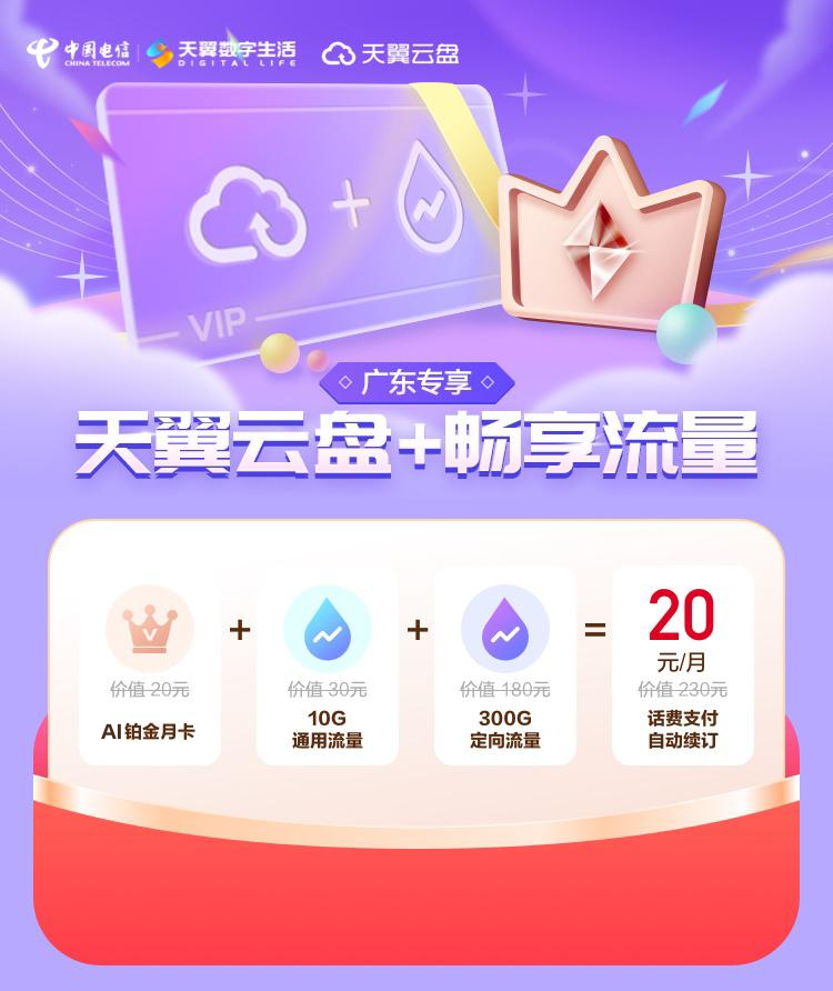 2、资费标准:20元/月,订购立即生效。自订购当月起,每月到账包含天翼云盘AI铂金会员,10G国内通用流量,300G天翼云盘定向流量